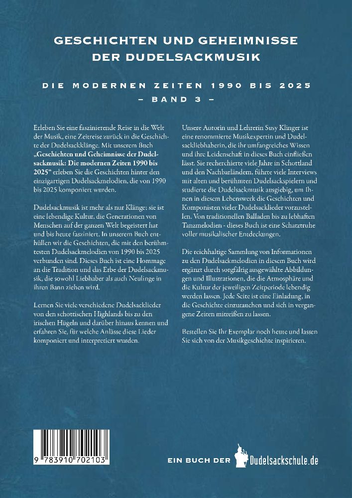 Erleben Sie eine faszinierende Reise in die Welt der Musik – eine Zeitreise durch die Geschichte der Dudelsackklänge. Mit unserem Buch „Geschichten und Geheimnisse der Dudelsackmusik: Die modernen Zeiten 1990 bis 2025“ entdecken Sie die Geschichten hinter einzigartigen Dudelsackmelodien, die in den Jahren 1990 bis 2025 komponiert wurden.