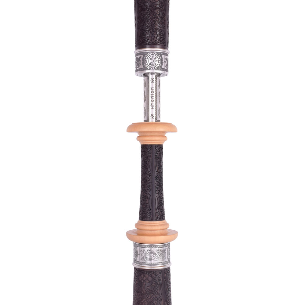 The PH1HC is distinguished by its laser-etched Celtic runic design on the Blackwood, ferrules, slides, ring caps, and mouthpiece slide, making it a true work of art. Traditionally, bagpipes feature combed and beaded wood, but this set introduces a refined and intricate design that sets it apart. The projecting mounts are crafted from first-grade boxwood, polished to a high natural lustre, providing a striking contrast to the Blackwood. Inspired by a 1910 mount profile, these mounts are more refined than those of later periods, blending tradition with innovation.
