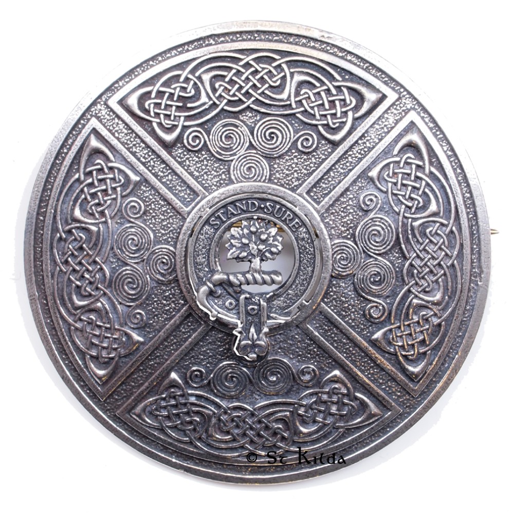 A larger alternative to our stone-set clan-crested plaid brooch, this new brooch features Celtic waves set around a simple saltire.