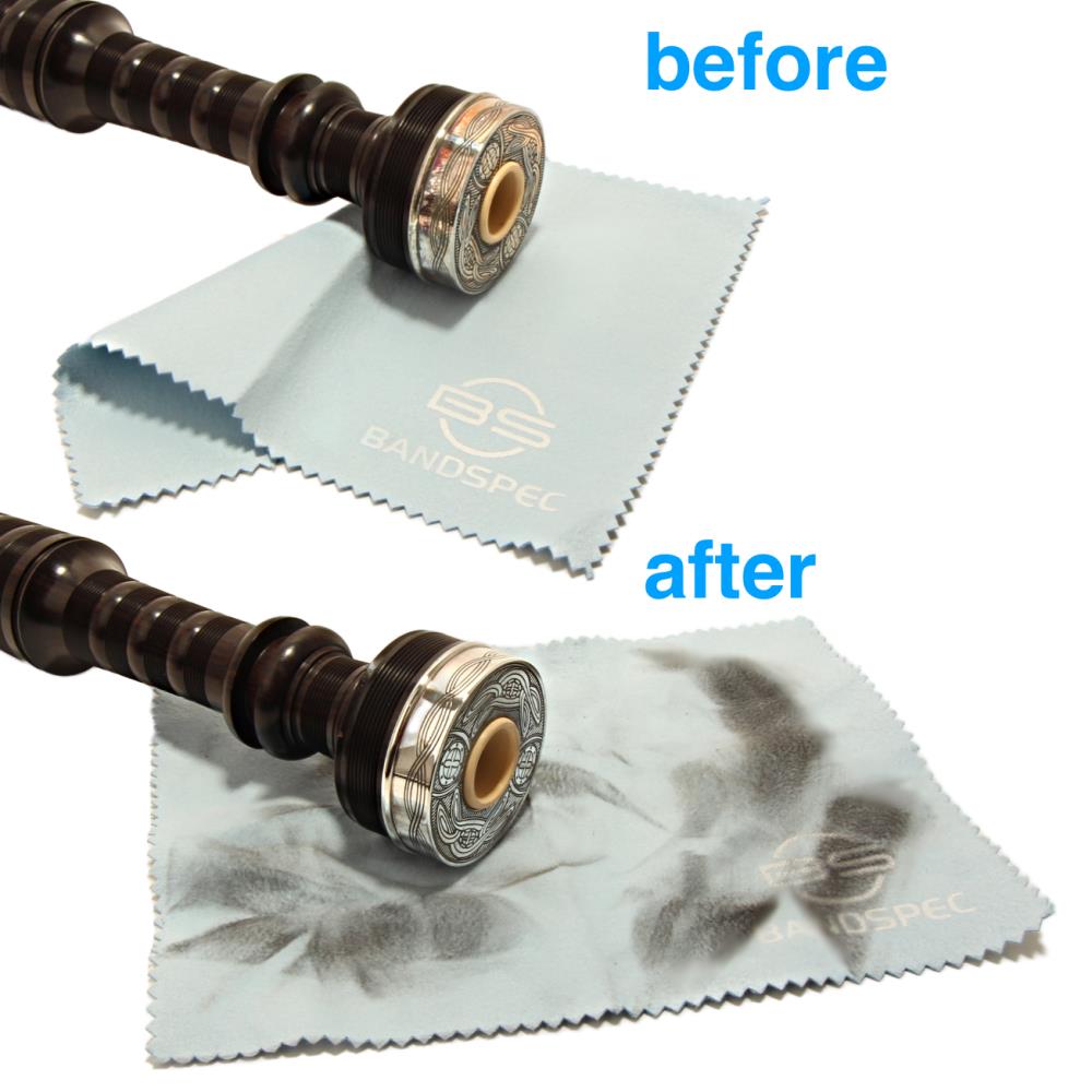Unlike liquid metal polish, the Bandspec polishing cloth is quick and easy to use and leaves no mess. The cloth does not leave any residue or stains on the wood. It's a dry cloth, very clean and leaves no marks.