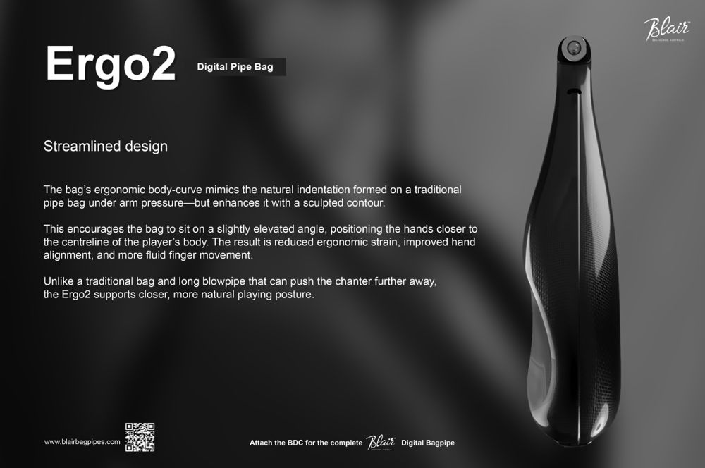 Die Korpusform orientiert sich an der natürlichen Einbuchtung eines traditionellen Pipesacks unter Armdruck und wird durch eine gezielt modellierte ergonomische Kontur ergänzt. Dadurch sitzt der Sack leicht erhöht und bringt die Hände näher an die Körpermitte. Das Ergebnis ist eine reduzierte körperliche Belastung, eine verbesserte Handposition und eine natürlichere Fingerbewegung.