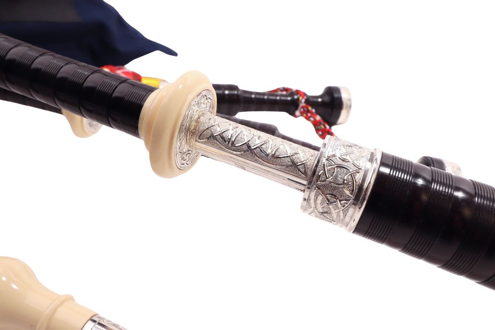 Offre spéciale unique sur un seul set, neuf, de cornemuse McCallum AB9-Deluxe. Fabriquée en African Blackwood et finie avec une superbe ornementation en argent sterling, gravée à la main, c’est un instrument d’exception pour les joueurs recherchant une esthétique raffinée et une sonorité riche et puissante.