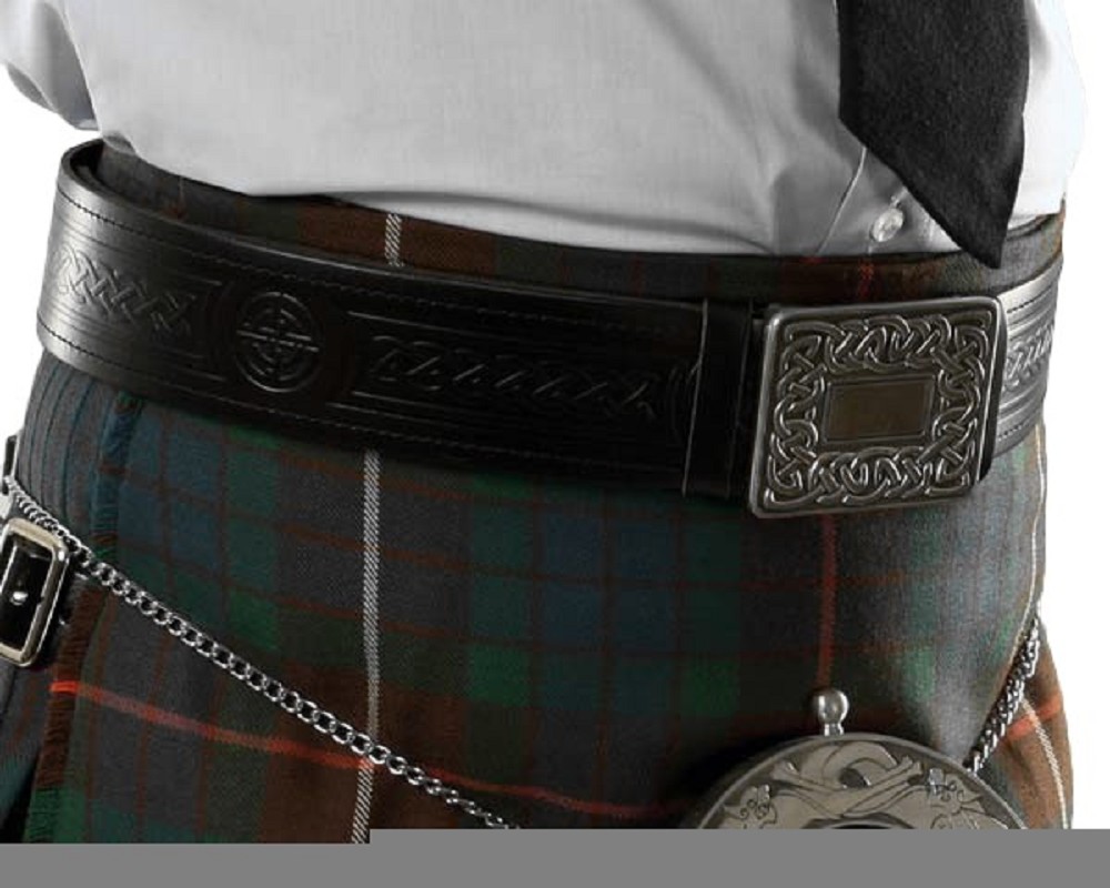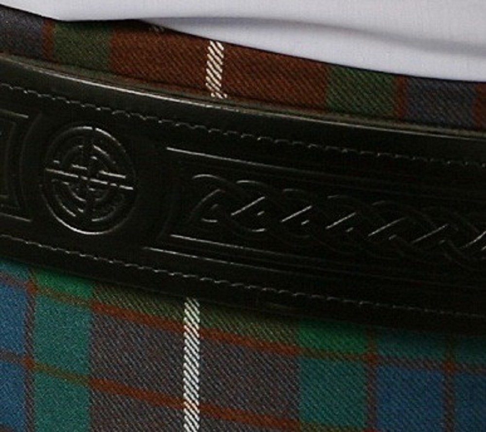 Real leather celtic embossed standard size kilt belt in black, 2 1/4" (5.7 cm) width.