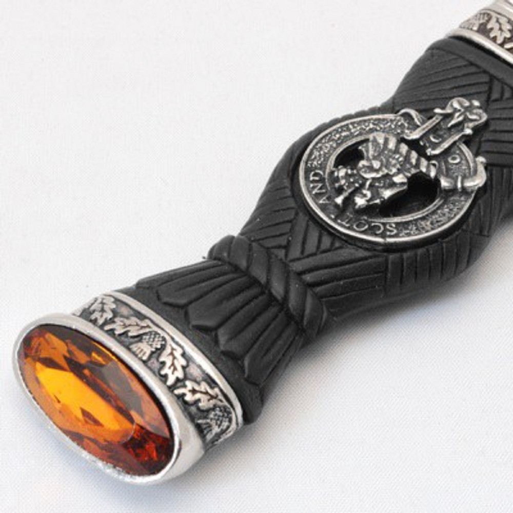 This Gaelic Themes Dress Sgian Dubh is hand crafted in Glasgow. The traditional 4-piece Metalwork is cast in lead-free pewter and is decorated with a multi facet cut and gold foil backed SWAROVSKI crystal stone.