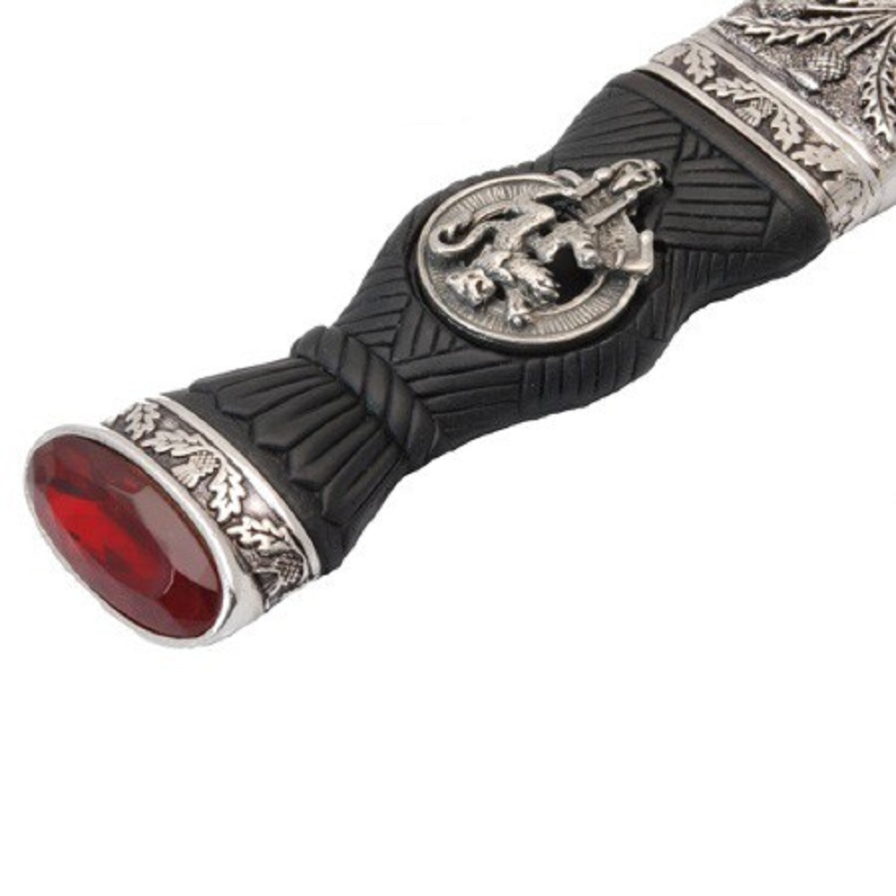 This Gaelic Themes Dress Sgian Dubh is hand crafted in Glasgow. The traditional 4-piece Metalwork is cast in lead-free pewter and is decorated with a multi facet cut and gold foil backed SWAROVSKI crystal stone.